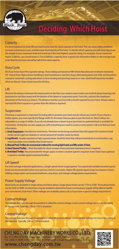 Cheng Day International Group excels in hoisting equipment manufacturing. We have 4 business departments: crane & hoist, elevator, parking system, and heavy duty. We are devoted to marketing plans, product design, manufacturing, tests, installation, and after-sales services.