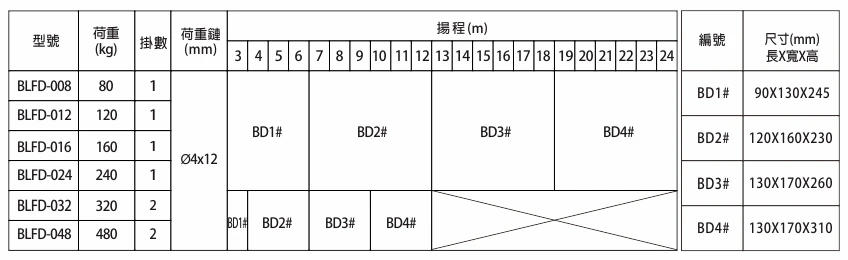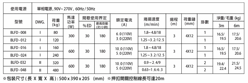 - 直流無刷吊車,因無碳刷裝置,無碳粉產生,馬達不會有火花產生,使用壽命長。