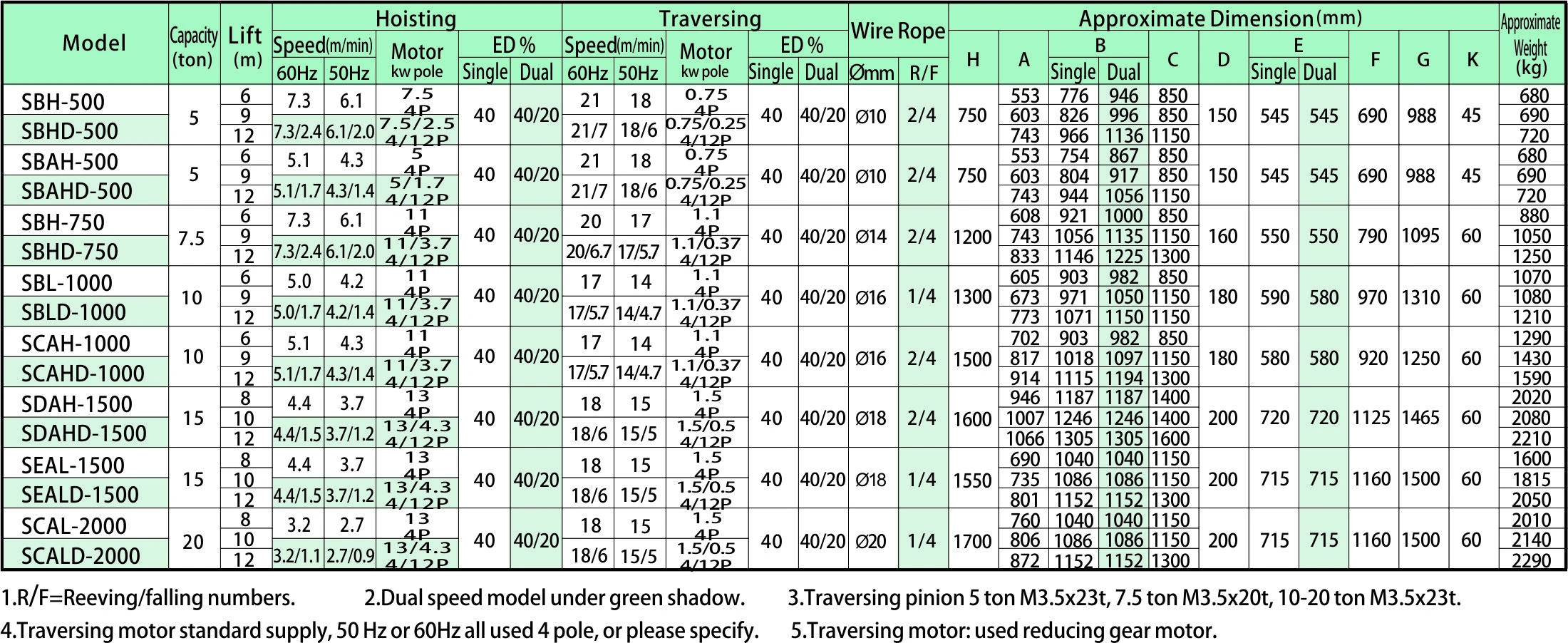 - Traversing motor: 2 ton used planetary reducing gear motor, 3-5 ton used reducing gear motor