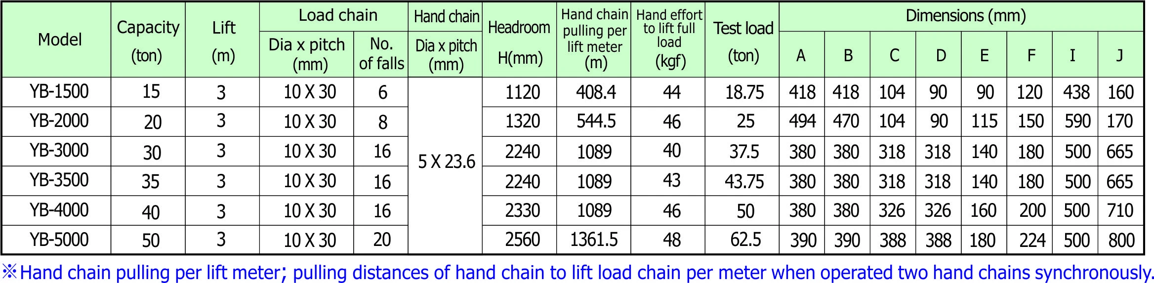 ※Hand chain pulling per lift meter; pulling distances of hand chain to lift load chain per meter when operated two hand chains synchronously.