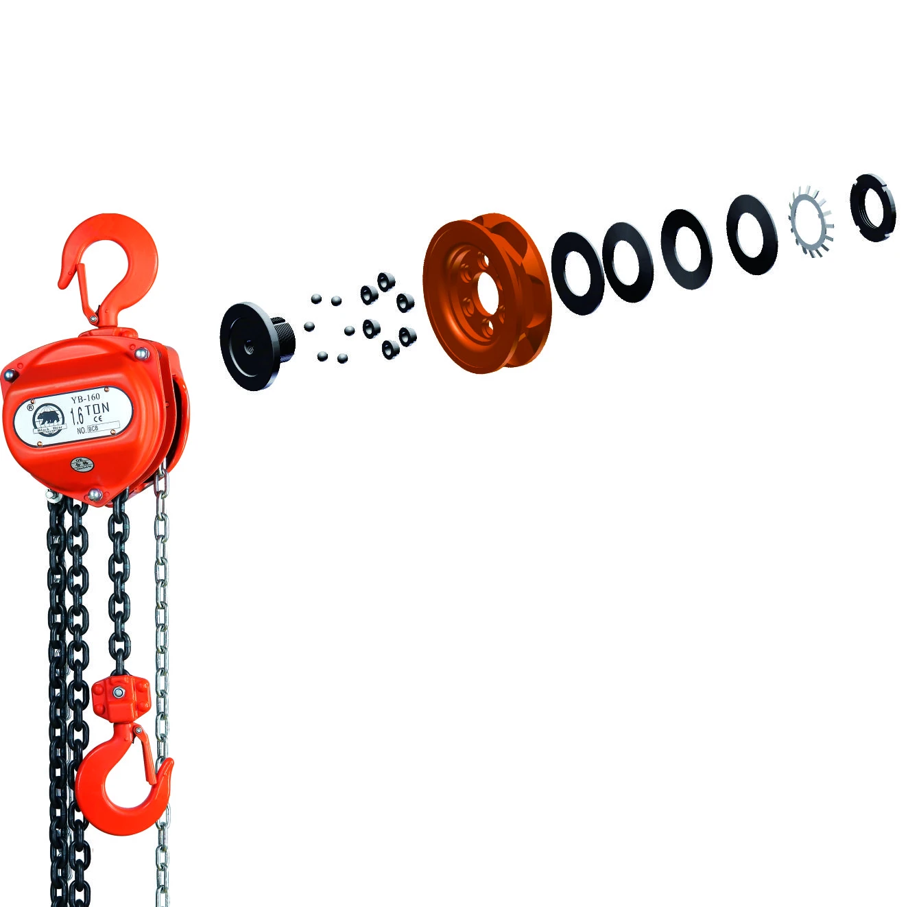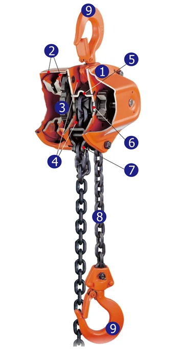 ![]() | 1.Steel Formed CasesBoth gear and hand chain wheel are protected by Hydraulic drew cases which is ideally shaped and rugged to be able to withstand external shocks. 2.Double Housing ProtectionHand wheel and brake are designed as the protection to prevent wet and dirt. 3.Brake MechanismNo matter how heavy the load, the brake works instantly when operation stopped; the lining material is non-asbestos with long lifetime. 4.Dual Ratchet PawlsDual Ratchet Pawls are applied for extra safety purpose. In case one ratchet pawl fails, the other still maintains its mechanical brake function. 5.Chain Guide/Load SheaveEnsure the load chain proper fitting the load sheave during operation and protect the load sheave from wet and dirt. 6.BushingBushing finished by surface hardened treatment and polish procedure serves to increase the mechanical efficiency and reduce the hand chain pull force. 7.Chain StopperWork as the lower limit to prevent over traveling during lowering the load. 8.Load ChainApplying grade 80 alloy chain specially calibrates for manual hoists and conforms to ISO and DIN standard. 9.Top and Bottom Hooks Ass'y / Hook HousingHooks with hot forged and heat treatment allow to be swiveled 360゚ and are equipped with safety latch to ensure proper hooking the load.