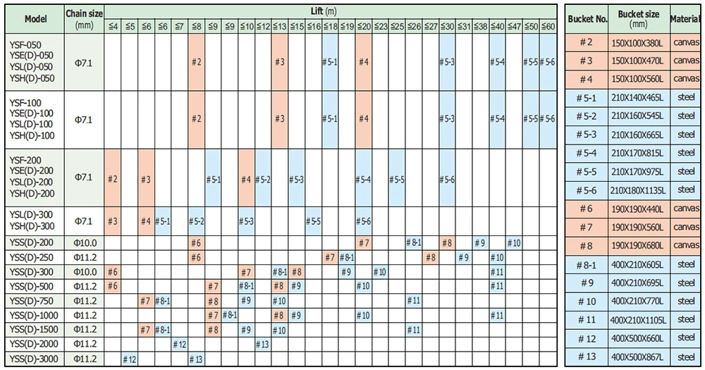 Chain Bucket No. Selection Table