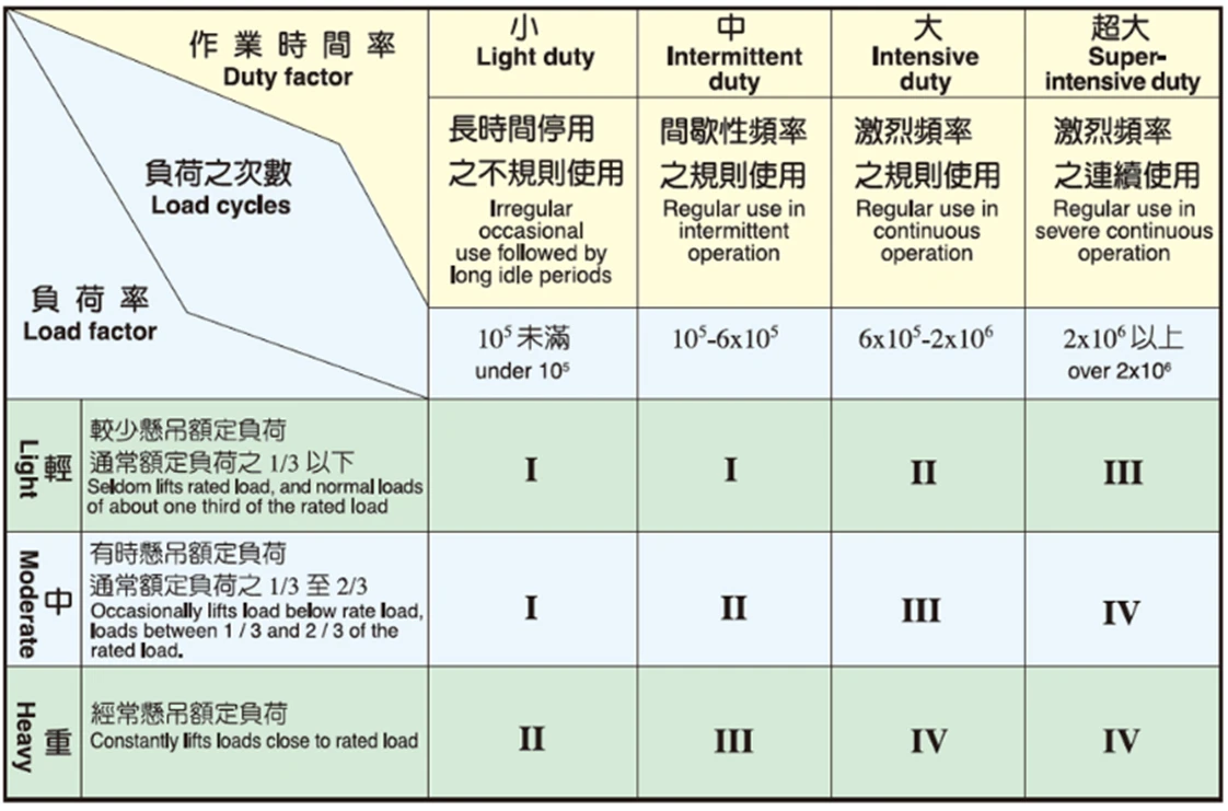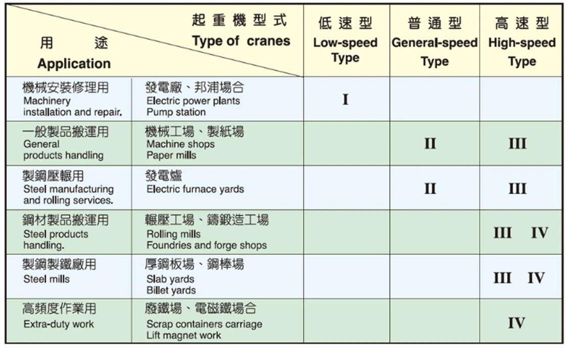 | 1.Crab TrolleyIt contains up/down hoisting and left/right traversing building together in the unit. Sometimes has main and secondary hoisting in the unit. Welding of crab frame is using structure steel. A layout of crab trolley is based on available space for an easier maintenance and a safety handrail is included. 2.GirderGirder's design is based on major standard requirements. It takes safe working load, girder span, application surrounding and class of usage into considerations. 3.Operator CabThere are two types of cab. One is total enclosed type, the other is semi-enclosed type. Cab can be installed exhaust fan and/or air conditioner upon request. 4.Electric Feeder For GirderGenerally, we use the flat cable festoon system.Application Chart |