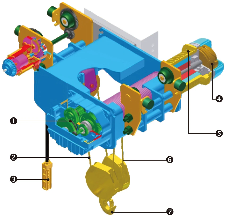 ![]() | 1. Mechanical Load BrakeThe advanced design of the mechanical load brake provides braking without hook drift, independent of the motor brake . 2. Wire RopeHigh Strength 19x7 IWSC (195kg/mm2 ) Wire Rope has swaged fittings on both ends. 3. Push Button Station(USA) IP-65 Push Button Station is standard and it's light weight and durable. 4. Motor BrakeOur DC Brake provides instant braking, with smooth, controlled starting and stopping. 5. MotorHoist duty motors are made of heavy cast iron that provide maximum cooling during even the toughest operating conditions. The class F motor insulation ( single speed ) are rated for H4 service. Other insulation classes and thermal rating are available upon request. 6. LiftTrue vertical lift standard on low headroom hoists. 7. HookOur high strength forged steel hook comes equipped with a safety latch and a thrust bearing which enables the hook to swivel 360 degrees. |