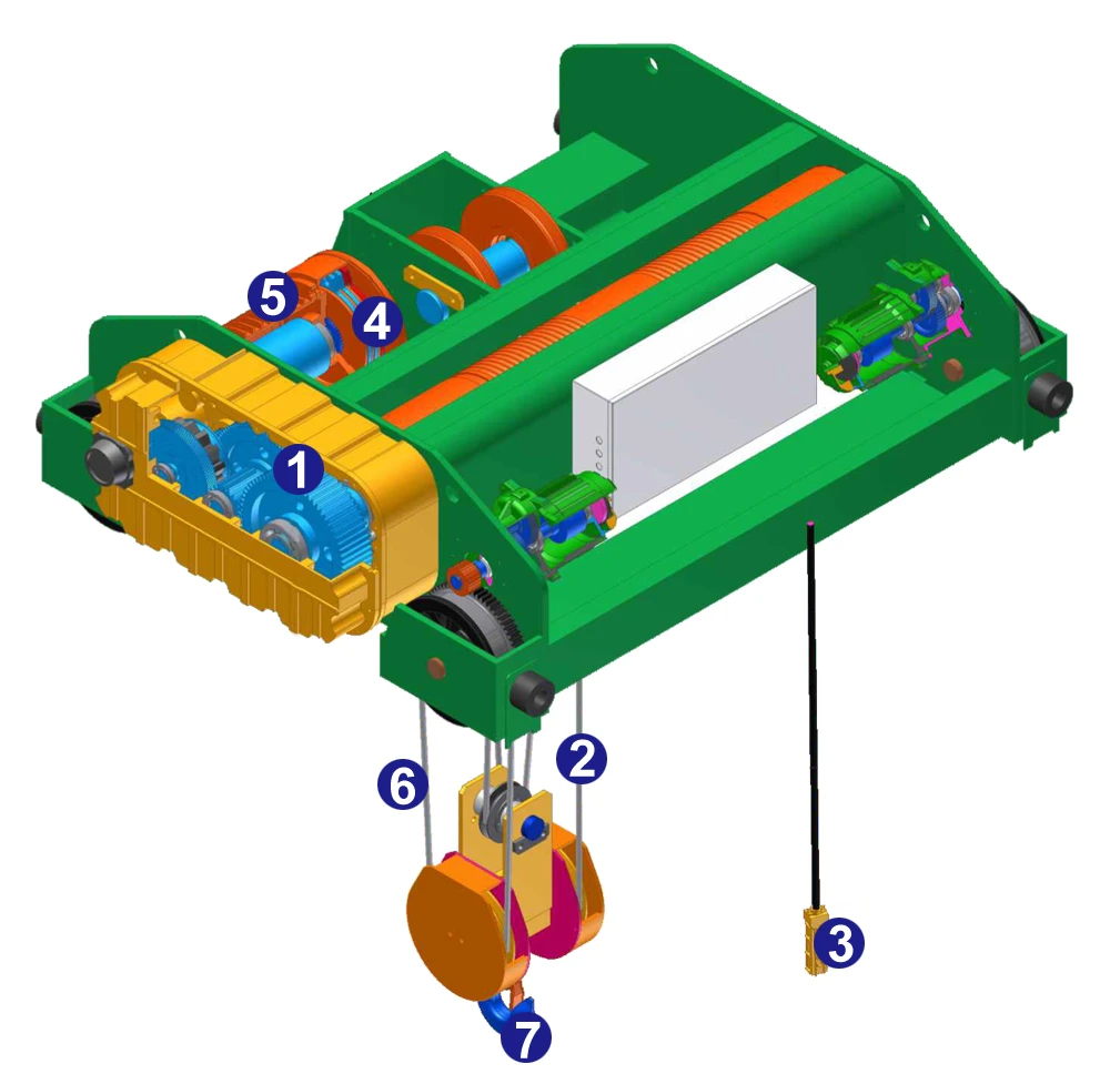 ![]() | 1. Mechanical Load BrakeThe advanced design of the mechanical load brake provides braking without hook drift, independent of the motor brake . 2. Wire RopeHigh Strength 19x7 IWSC (195kg/mm2 ) Wire Rope has swaged fittings on both ends. 3. Push Button Station(USA) IP-65 Push Button Station is standard and it's light weight and durable. 4. Motor BrakeOur AC Brake provides instant braking, with smooth, controlled starting and stopping. 5. MotorHoist duty motors are made of heavy cast iron that provide maximum cooling during even the toughest operating conditions. The class F motor insulation ( single speed ) are rated for H4 service. Other insulation classes and thermal rating are available upon request. 6. LiftTrue vertical lift standard on low headroom hoists. 7. HookOur high strength forged steel hook comes equipped with a safety latch and a thrust bearing which enables the hook to swivel 360 degrees. |